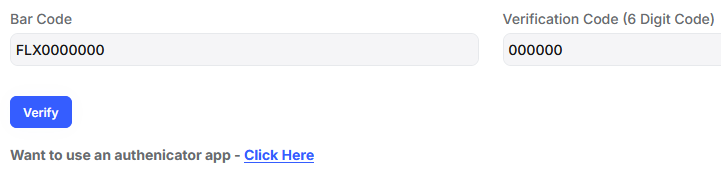 10. You will be presented with the screen below. The barcode will be the numbers on the back of the device that starts with FLX. The verification code will be the numeric 6 digit code that will appear when you press the button on the authenticator device. Once your done press "Verify".